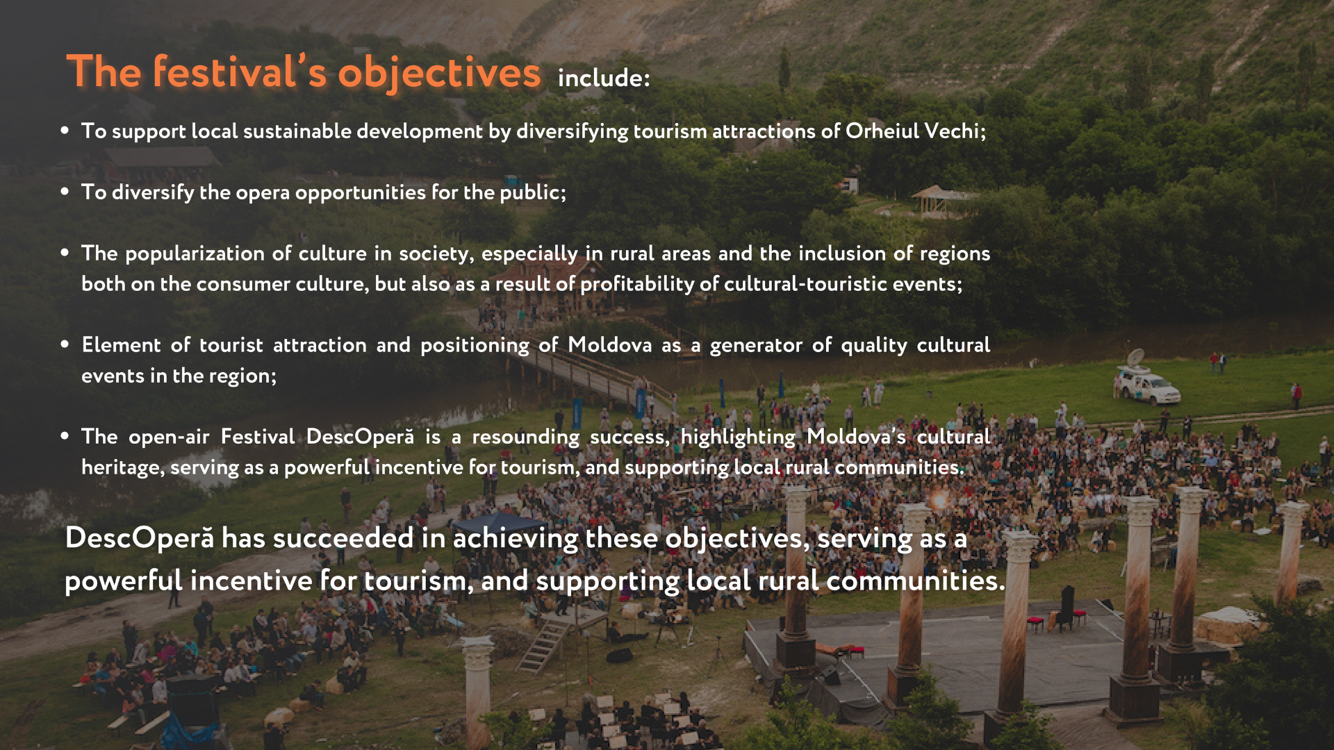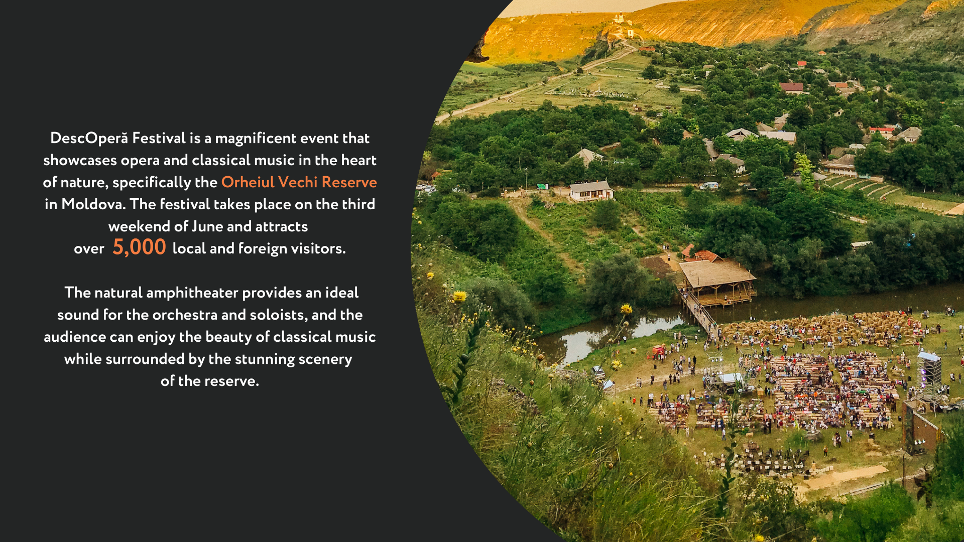 Festivalul DescOperă scoate opera și muzica clasică din sălile de concert tradiționale și le aduce în mijlocul naturii, transformând un peisaj spectaculos într-o scenă vie de sunet și emoție. Înconjurați de stânci, cer deschis și viața autentică de sat, spectatorii trăiesc experiența unor spectacole într-un amfiteatru natural cu o acustică remarcabilă.